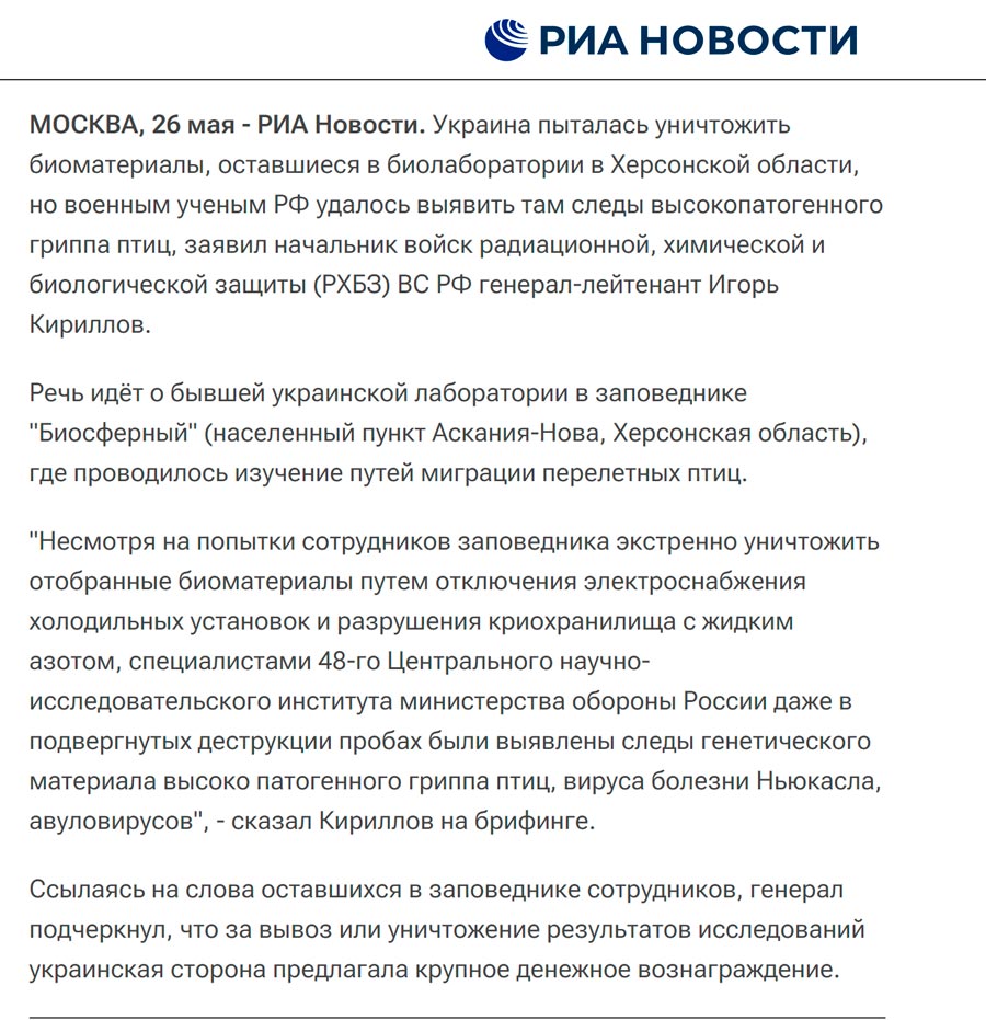 «Я навіть боюся думати, як окупанти уявляють собі шляхи передачі пташиного грипу, який нібито зберігається в пробірці зі спермою великої рогатої худоби? В принципі, це мало дивує з огляду на ту кількість фейкометів і на той рівень брехливої пропаганди, який взагалі розкручений в Російській Федерації. Єдине в такому контексті можу додати, що для мене незрозуміло, чому не згадали про два біотуалети, які перебували на балансі селищної ради Асканія-Нова? Ці “біооб'єкти”, дійсно ситуаційно функціонували. Все інше – це просто домисли, брехня і відверті фейки».