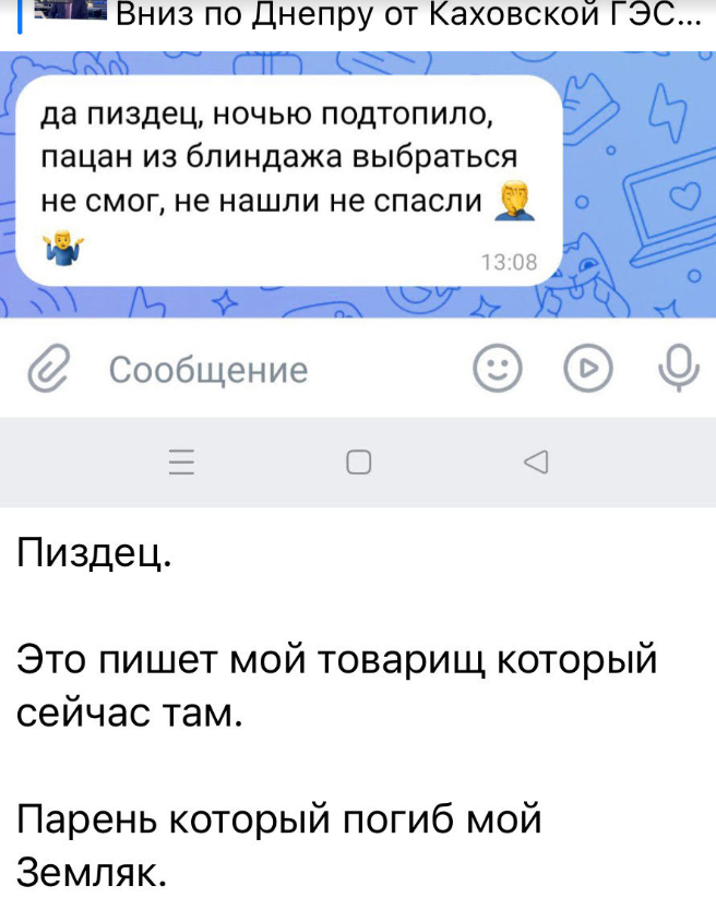 «Вода прибуває кожного дня, є загроза прориву греблі Каховського водосховища. Днями затопило позиції на одній ділянці біля річки, вода прибувала так швидко, що один із наших бійців потонув у бліндажі. І речей до хріна у хлопців потонуло», – пише російський пропагандистський телеграм канал.