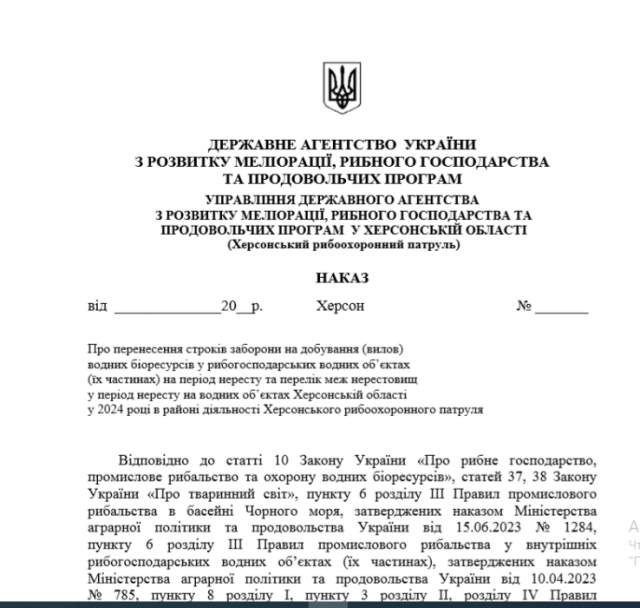 В документі зазначено, що любительське та промислове рибальство у р. Дніпро в межах Херсонської області, включаючи зону затоплення Каховського водосховища та придаткову заплавну систему – з 10 квітня по 15 червня 2024 року.