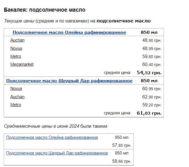 Зокрема, соняшникова олія Олейна рафінована порівняно з минулим місяцем подорожчала з 57,85 грн до 54,52 грн за 850 мл. Щедрий Дар став дорожчим майже на 3 гривні – 61,03 грн за 850 мл. Зверніть також увагу, що на полицях різних супермаркетів ціна відрізняється: