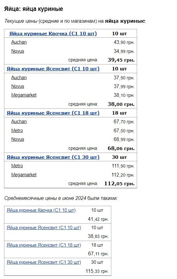 Ситуація з курячими яйцями краще – вони трохи подешевшали. Так Квочка продаються в середньому по 39,45 грн, замість 41,42 грн за десяток. Ясенсвіт подешевшав на 83 копійки, до 38,00 грн за десяток. За 30 штук таких самих яєць доведеться віддати 112,05 грн.