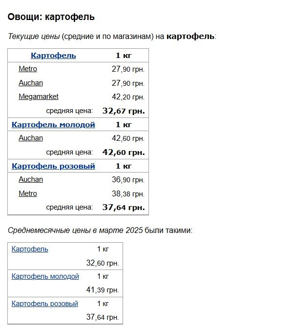 Ціна на картоплю залишилася майже без змін. Звичайна картопля показала мінімальне зростання з 32,60 до 32,67 грн, молода картопля подорожчала з 41,39 до 42,60 грн, а рожева залишилася на тому ж рівні – 37,64 грн за кілограм.