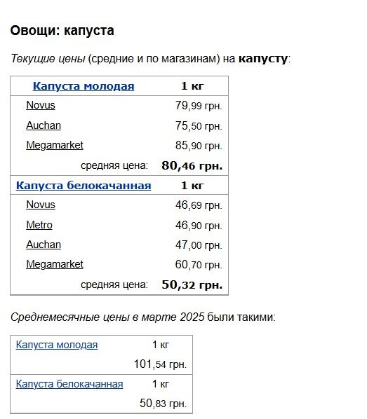 Молода капуста показала найбільше зниження ціни. Якщо в березні її середня вартість становила 101,54 грн за кілограм, то зараз вона впала до 80,46 грн, що означає здешевлення на 21%. Білокачанна капуста також трохи подешевшала – з 50,83 до 50,32 грн за кілограм.