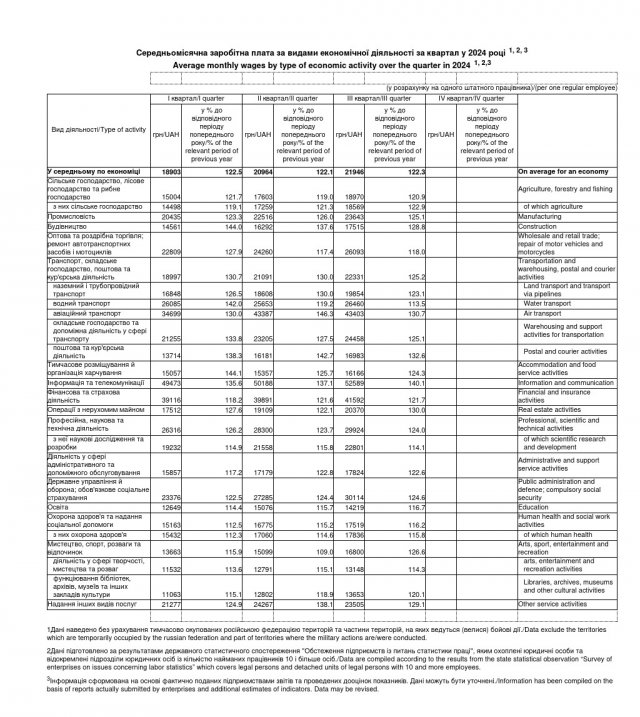 Розмір середньомісячної зарплати в Україні у третьому кварталі 2024 року становив 21 946 грн, що на 22% більше у порівнянні з аналогічним періодом 2023 року.Такі дані оприлюднив Держстат.Найбільші зарплати зараз у нашій країні у працівників у сфері інформації та телекомунікацій – 52 589 грн, авіаційного транспорту – 43 403 грн, фінансової та страхової діяльності – 41 582 грн, державного управління та оборони, обов'язкового соціального страхування – 30 114 грн, а також у працівників сфери професійної, наукової та технічної діяльності – 29 924 грн.