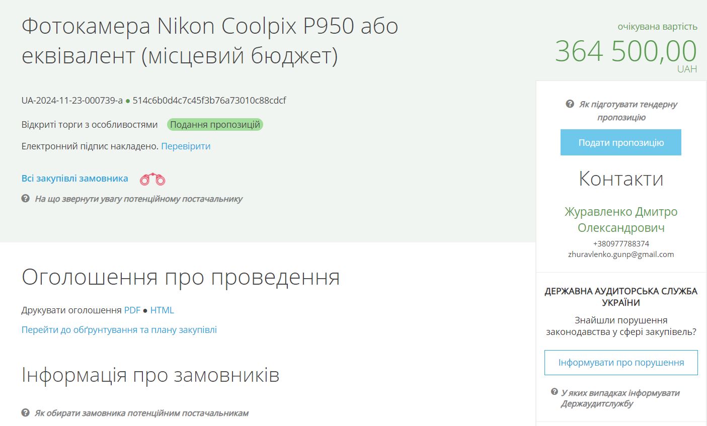 Загальна вартість закупівлі 364 тисяч 500 гривень. Отже, за один фотоапарат планують заплатити орієнтовно 40 тисяч 500 гривень.