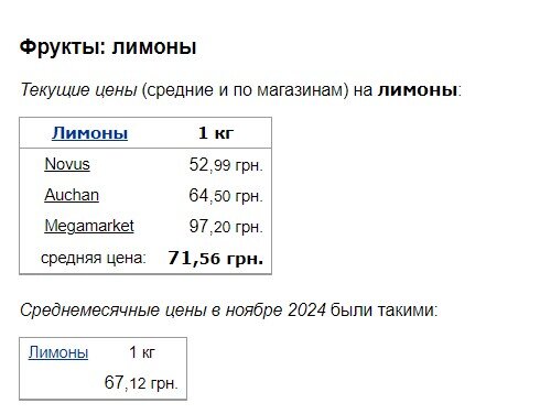 Не обходиться зимовий сезон і без лимонів, адже багато хто любить пити з ними чай, а дехто навіть любить вживати в природному вигляді. Його середня вартість зросла з 67,12 грн/кг до 71,56 грн/кг. Найдорожче вони обійдуться в МегаМаркет – 97,20 грн/кг, а дешевше в Новус – 52,99 грн/кг.