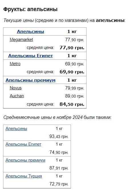 Цінник на апельсини опустився з 93,43 грн/кг до 77,90 грн/кг. Єгипет подешевшав з 74,90 грн/кг до 69,90 грн/кг. А ось преміум подорожчали із 72,79 грн/кг до 84,50 грн/кг.