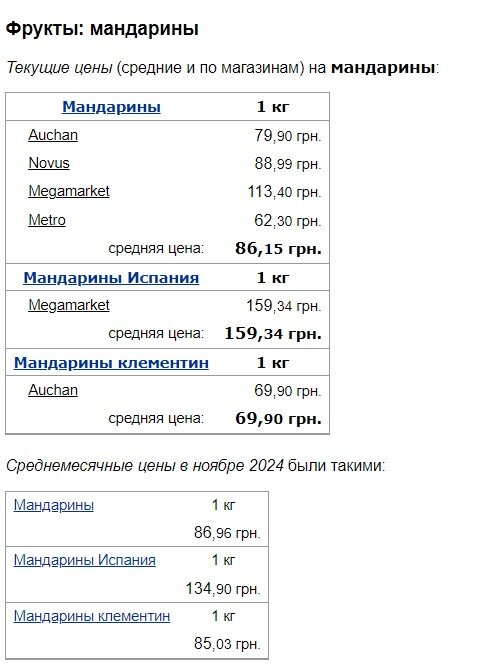 Зокрема, кілограм мандаринів продається в середньому по 86,15 грн. Проте в окремих торгових мережах цінник на них значно вищий – 113,40 грн/кг у МегаМаркеті. А ось в Ашан вони обійдуться найдешевше – 79,90 грн/кг. Мандарини Іспанія ви можете придбати по 159,34 грн/кг, що помітно дорожче ніж минулого місяця – 134,90 грн/кг. Клементин, навпаки, подешевшали з 85,03 грн/кг до 68,90 грн/кг.