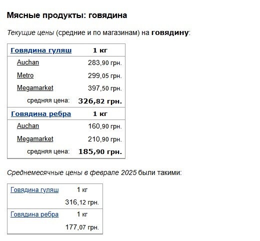 Середня ціна яловичини гуляш зросла з 316,12 грн до 326,82 грн за кілограм. Яловичина ребра також подорожчала – з 177,07 грн до 185,90 грн за кілограм.