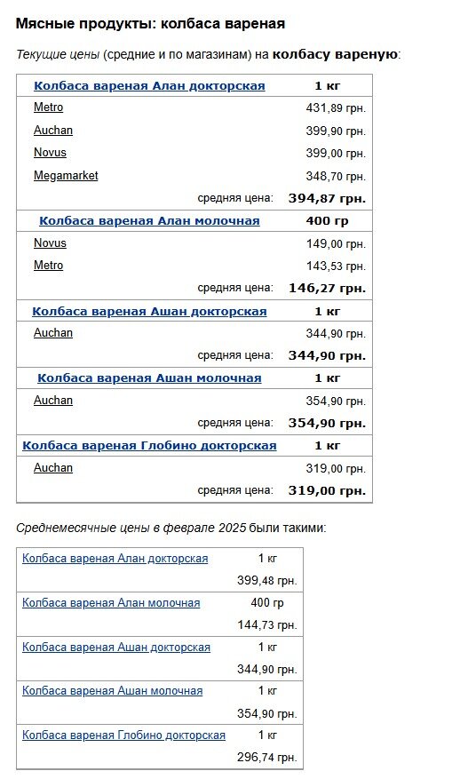 Варена ковбаса "Алан докторська" подорожчала на кілька копійок – з 399,48 грн до 399,87 грн, а "Глобино докторська" підскочила в ціні з 296,74 грн до 319,00 грн за кілограм.