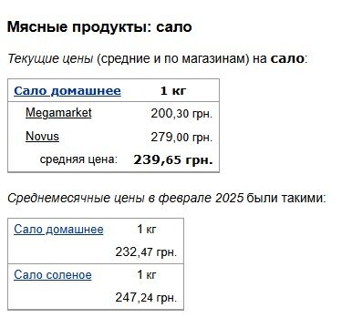 Традиційний продукт української кухні – сало – також подорожчало. Середня ціна на домашнє сало підвищилася з 232,47 грн до 239,65 грн за кілограм. При цьому найдешевше воно обійдеться у МегаМаркет – 200,30 грн/кг, а в Новус доведеться віддати 279,00 грн/кг.