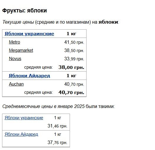 Зокрема, у лютому спостерігається помітне зростання вартості цих фруктів порівняно з січнем. Українські яблука подорожчали в середньому з 31,46 до 38,00 гривень за кілограм. Яблука сорту Айдаред показали більш помірне зростання – з 37,76 до 40,70 гривень за кілограм.