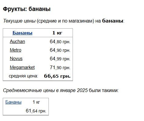 Щодо бананів, їхня вартість зросла з 61,64 до 66,65 гривень за кілограм. При цьому розкид цін у різних торговельних мережах доволі незначний – від 64,80 до 71,90 гривень за кілограм.