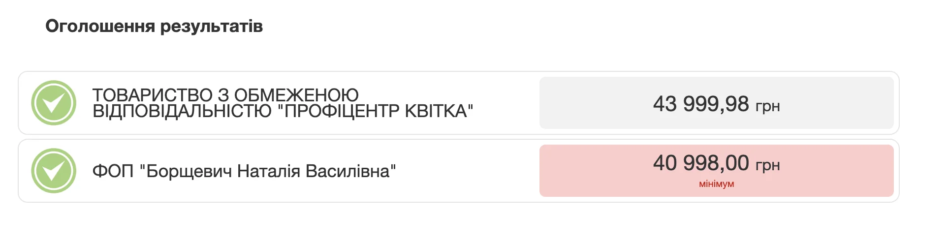 ДСА обрала дешевшу пропозицію та 18 листопада уклала контракт з Борщевич.Хоча ціни на генератори, які пропонували учасники, є близькими до середньоринкових, пропозиція “Профіцентр Квітка” з технічного боку була більш вигідною, адже їхній генератор має підсилений двигун, більший паливний бак, подвійне паливне живлення та більш сучасну електроніку.