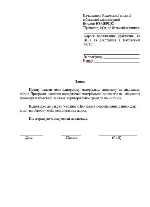 - Заявник на отримання матеріальної допомоги повинен бути зареєстрованим лише на території Каховської міської територіальної громади.
