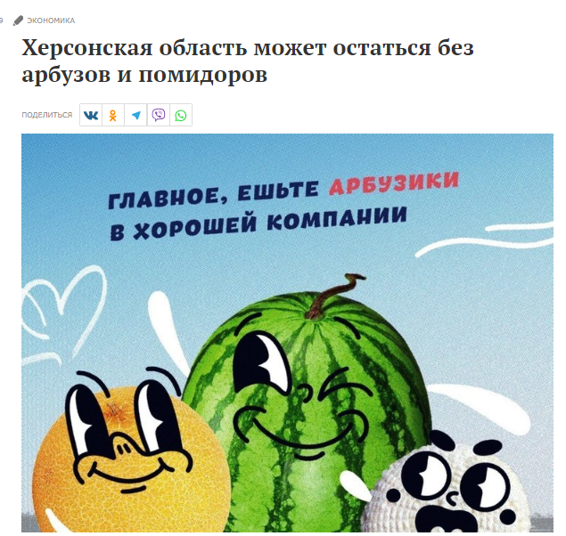 “Скоро до нас завозитимуть кавуни та дині. По овочах проблеми ті ж самі. В області дефіцит овочевої продукції. Баштанний сезон добігає кінця. Аномальна спека зробила свою справу. На поливних баштанних полях падіння врожаю 10-30%. На богарних (тобто які не зрошуються штучно) – ситуація катастрофічна”, – повідомив російським ЗМІ Павло Кім, фермер-колаборант з окупованого Скадовського району.