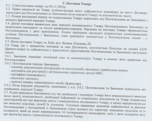 Авто мають поставити до 6 листопада 2023 року за київською адресою: вулиця Велика Кільцева, 2Б. Принаймні так зазначили в угоді.