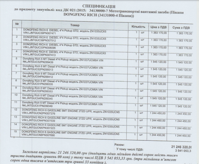 Згідно зі специфікацією, закуповують 15 авто — пікапів DONGFENG RICH різних моделей:- 4 авто за 1,3 млн грн
