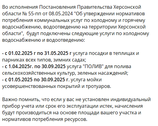 Тим, хто не встигне до цієї дати, окупаційна влада обіцяє нараховувати за водопостачання за встановленими нею ж нормативами. У постанові «правительства» Херсонської області №55-пп від 8 травня 2024 року норматив на полив присадибної ділянки наразі складає близько 600 рублів на місяць за кожну сотку, а з 1 липня – на 100 рублів більше. Додатково доведеться платити за витрати води на кожну корову, курку чи качку і навіть за полив прибудинкового тротуару. На «нормативний» тариф з водопостачання в будинку впливатиме навіть довжина ванної!