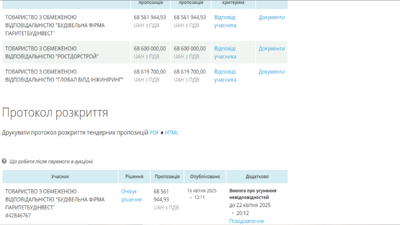 Аукціон відбувся 16 квітня за участі трьох компаній: "Ростдорстрой», "Глобал білд інжинірінг" і "Паритетбудінвест". Саме остання подала найнижчу цінову пропозицію — на 57,7 тисячі гривень менше очікуваної вартості. Наразі компанія очікує на рішення і до 22 квітня мала усунути технічні недоліки у своїй тендерній пропозиції.
