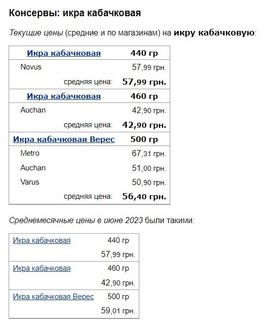 Тим часом кабачкова ікра порівняно з минулим місяцем у ціні не змінилася – 57,99 грн за 440 грам. А ось кабачкова ікра Верес навіть подешевшала з 59,01 до 56,40 грн за 500 грам.