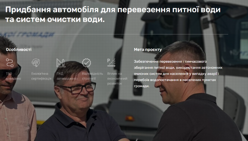 Мета проєкту полягає у забезпеченні перевезення і тимчасового зберігання питної води, використання автономних очисних систем для населення у випадку аварії і перебоїв водопостачання в населених пунктах громади.Фінансування на придбання відповідної техніки передала Програма Розвитку Організації Об'єднаних Націй (ПРООН). Проєкт реалізується від жовтня 2024 року.