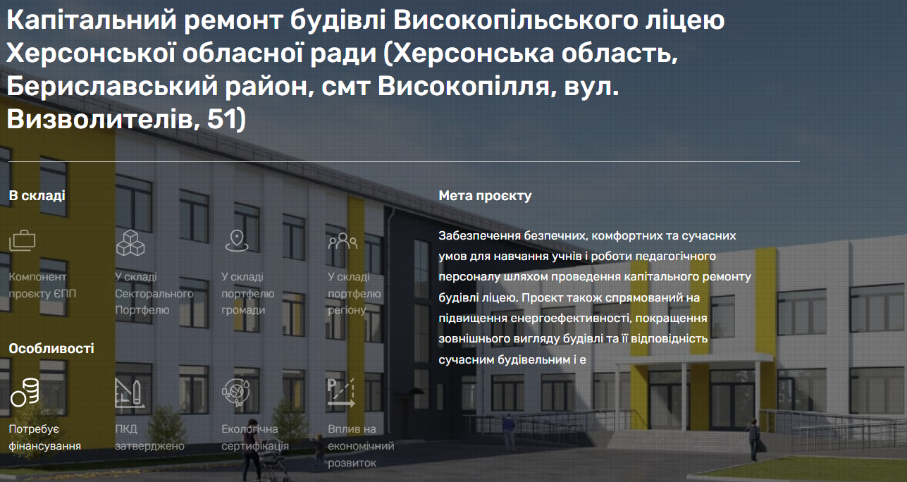 Високопільський ліцей. Фото: Олег Батурін/ЦЖРВ Бериславському районі на Херсонщині планують відбудувати будівлю Високопільського ліцею. На це планують виділити майже 35 мільйонів гривень.Як розповів Центр публічних розслідувань, відповідне оголошення оприлюднили в цифровій екосистемі Dream.Напочатку року управління освіти й науки Херсонської обласної державної адміністрації ініціювало капітальний ремонт ліцею. Капремонт передбачає комплекс заходів для покращення технічного стану будівлі, забезпечення її енергоефективності та створення безпечних і комфортних умов для учнів та працівників.