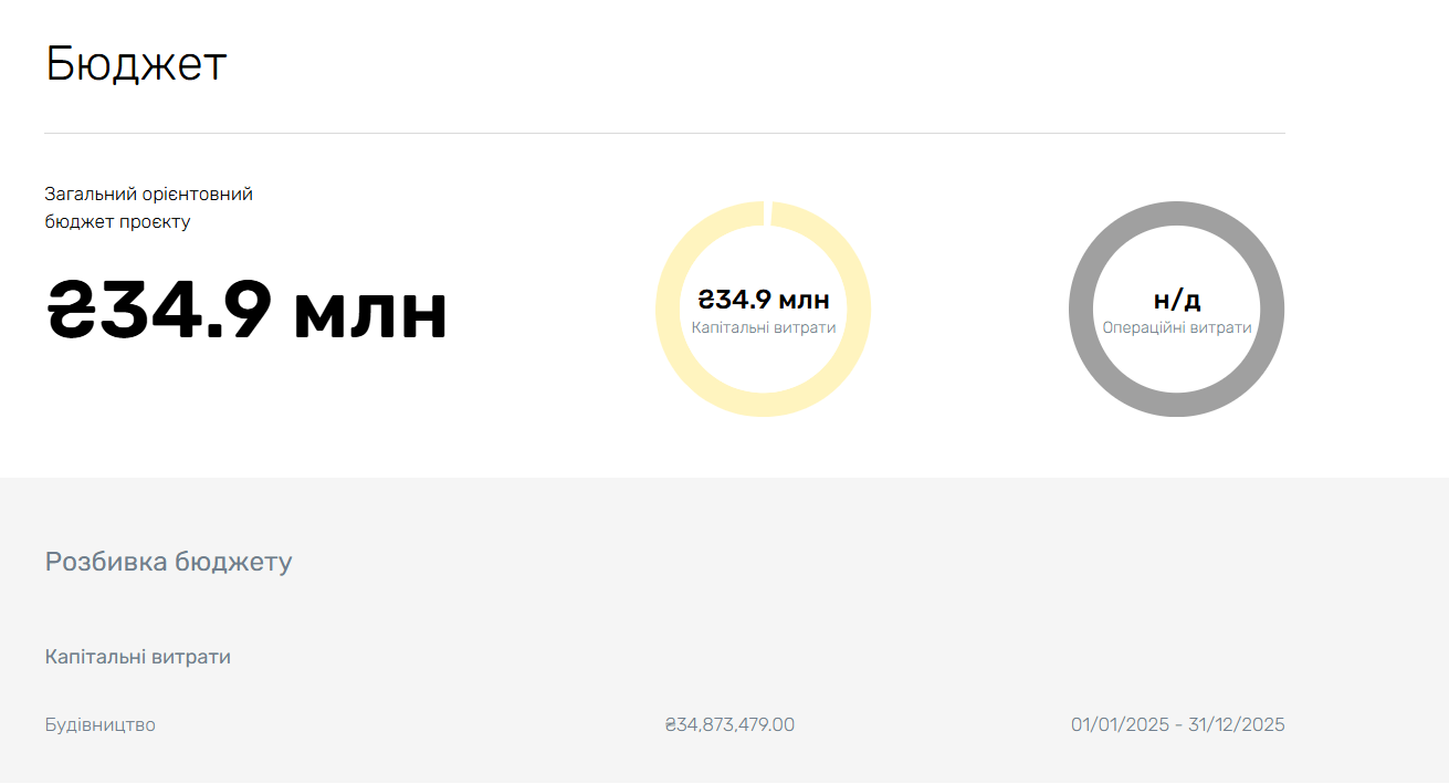 Бюджет проєкту складає 34,9 мільйона гривень. Однак джерела фінансування ще не визначені.