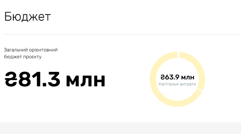 Бюджет проєкту становить 81 мільйон 300 тисяч гривень та складається з капітальних та операційних витрат. На придбання обладнання планують витратити 20 мільйонів 131 тисячу 768 гривень, будівництво буде коштуватиме 43 мільйонів 727 тисяч 300 гривень, а на операційні витрати піде 17 мільйонів 413 тисячі 136 гривень.