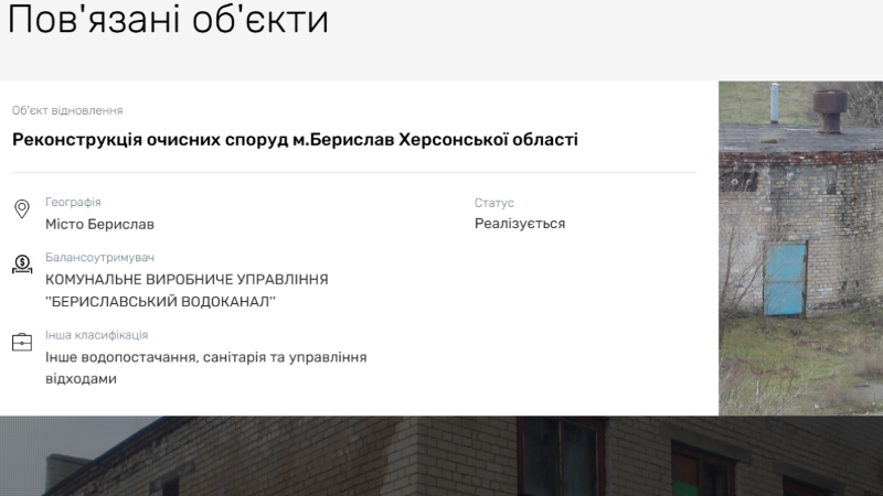 Очисні споруди Берислава, збудовані в 1972 році, не працюють з 2003 року через аварію, а їх стан є аварійним. Проблема старих очисних споруд актуальна для багатьох українських міст, оскільки більшість систем водовідведення були побудовані в радянський період і наразі потребують оновлення.
