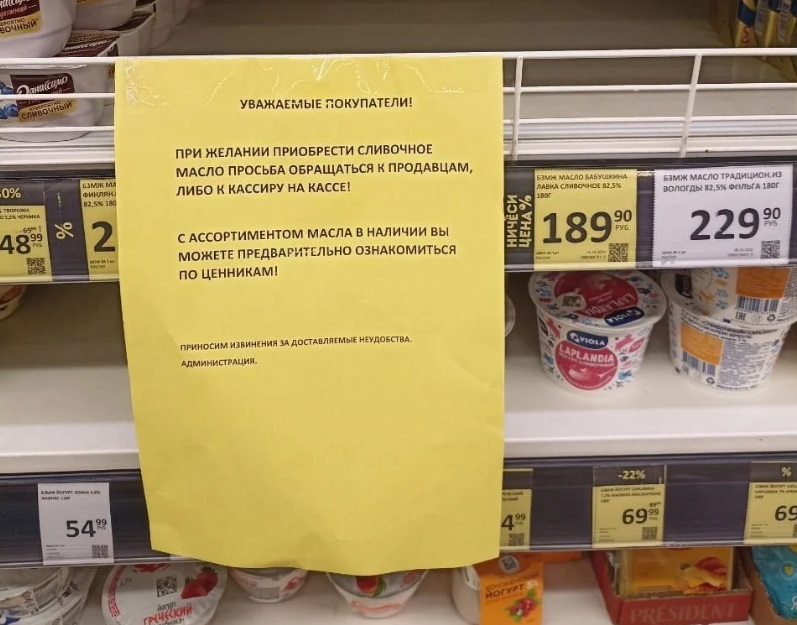Між тим ціни на вершкове масло стрімко підвищуються і в самій Росії. За повідомленням тамтешніх медіа, в Санкт-Петербурзі та інших містах масло вже перенесли до категорії преміальних товарів. Його тепер розміщують в закритих холодильниках поруч із касою разом із червоною ікрою та іншими «елітними» товарами, щоб запобігти крадіжкам.