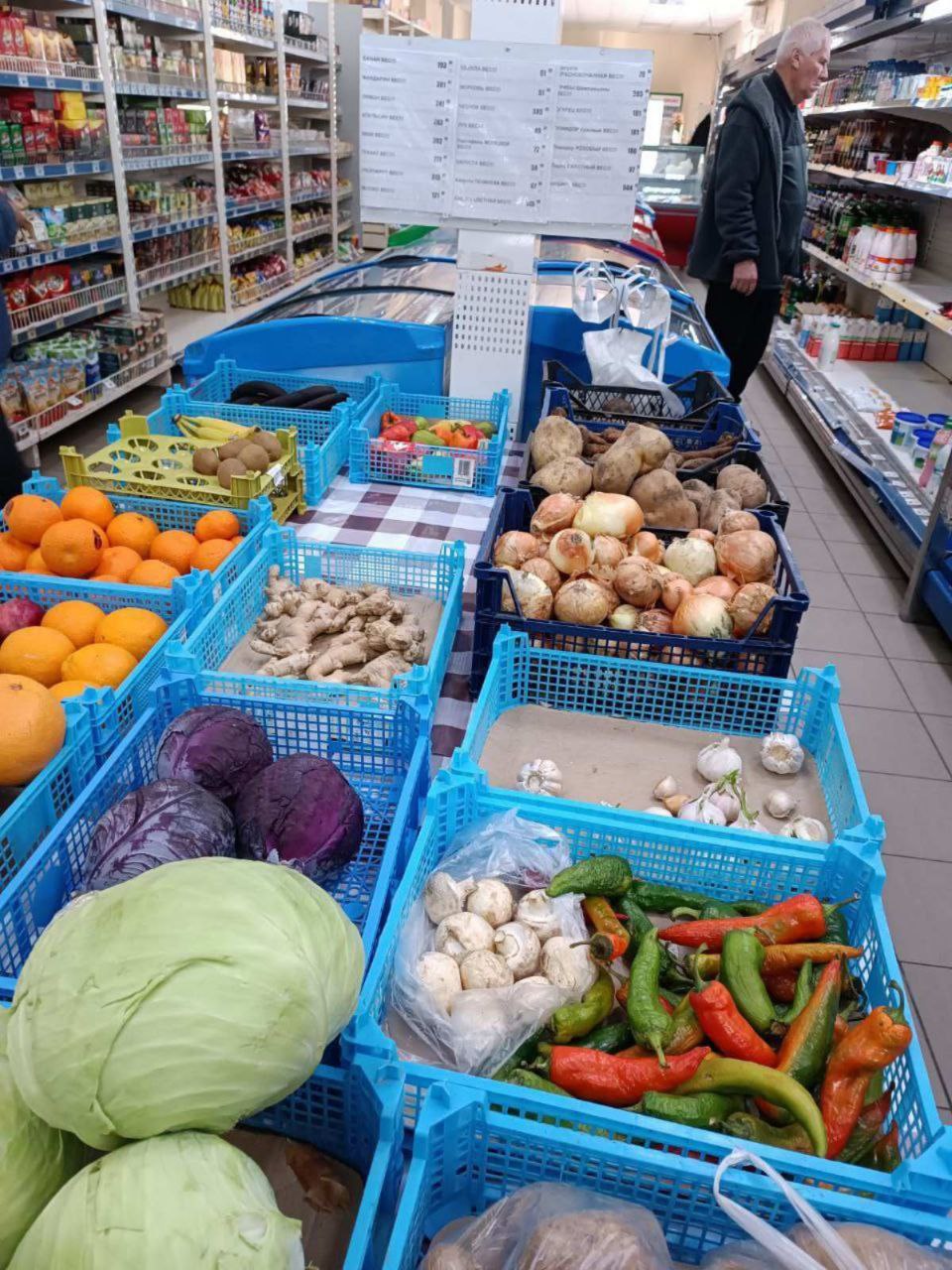 Домашні яйця продають по 200, магазинні – по 110 – 130 рублів за десяток. Домашнє молоко коштує 100 руб/л, сметана – 400 рублів за півлітра, магазинна з Мелітополя – 160 (у пачці – 400 г), хоча ще місяць тому була 99 рублів. Огірки коштують від 220 до 300, помідори – 150 – 180, картопля – 60 – 70 (якщо брати сіткою – 55), морква і буряк – по 60, цибуля і капуста – по 40 руб/кг. Мандарини продають по 200 – 220, гранати – 250, лимони – 150 – 200, яблука – 110 – 120 руб/кг. Плитка «Бабаєвського» шоколаду ще недавно коштувала 80 – 100, зараз – від 120 рублів.
