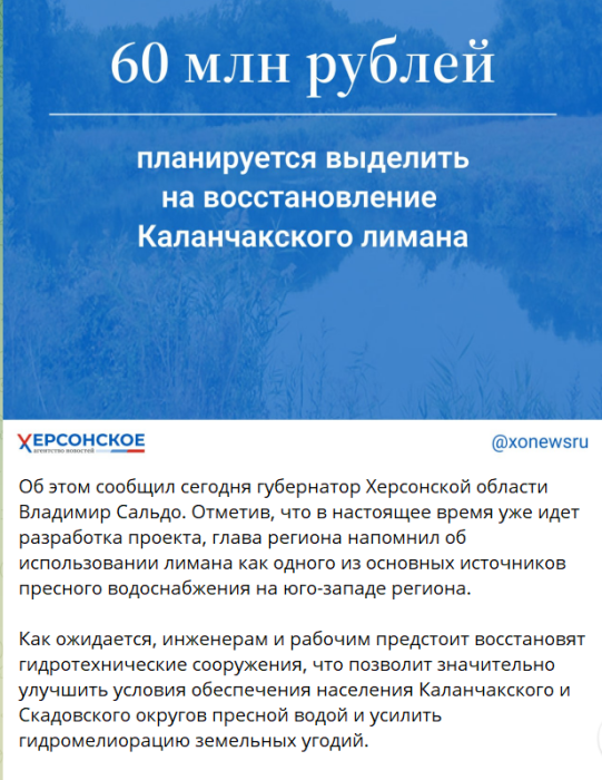 Окупаційна влада на Херсонщині оголосила про наміри «відновлення» Каланчацького лиману, який вони самі і зруйнували підривом Каховської ГЕС.Про це повдіомляють окупаційні медіа, зазначає Район.Скадовськ.Так, йдеться про виділення 60 мільйонів рублів (близько 30 мільйонів гривень) на «відновлення» лиману. В планах окупантів — відновити гідротехнічні споруди, аби забезпечити громади водою для побутових потреб та гідромеліорації.