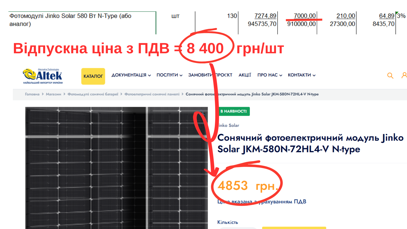 Крім того, 130 фотомодулів Jinko Solar 580 Вт N-Type замовили по 8 400 грн. Однак компанія «Altek» продає їх по 4 853 грн, «Solar market» – по 4 600 грн, а «Правильне електроживлення» – по 4 578 грн. Тобто на 42-46% дешевше від кошторисної ціни.