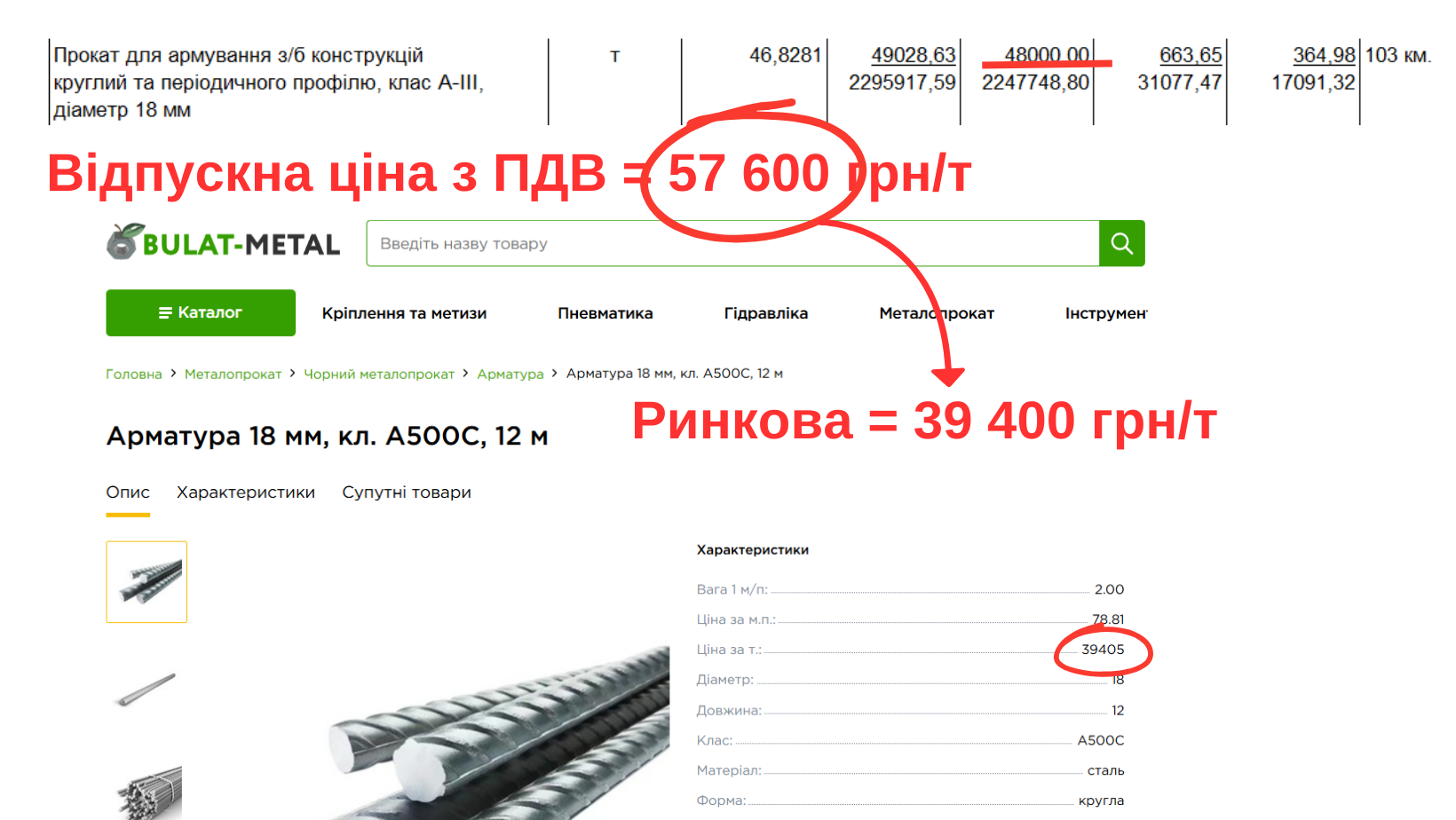 Гарячекатана арматура періодичного профілю класу А-ІІІ різних діаметрів на 20-30% дорожча від ринку. Наприклад, діаметр 18 мм врахували по 57 600 грн/т. Компанія «Булат-Метал» продає його по 39 405 грн/т, а «Метінвест-СМЦ» у Миколаєві – по 34 425 грн/т.
