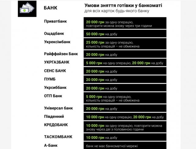 Кредобанк встановив ліміт 10 тис. грн за одну операцію, але її можна повторити через 2,5 години. Таскомбанк дозволяє клієнтам зняти до 10 тис. грн на добу.