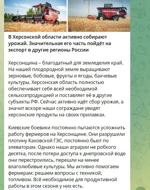 - закамуфлювати реальний катастрофічний стан аграрної галузі на окупованих теріторіях України внаслідок війни та окупації;