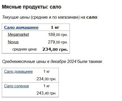 Сало домашнє (1 кг) не змінилося в ціні, залишившись на рівні 234 грн. При цьому різниця в цінах між магазинами суттєва – від 189 грн у Megamarket до 279 грн у Novus.