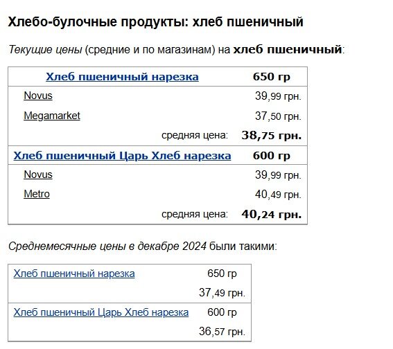 Щодо хліба, ціни дещо зросли. Пшеничний хліб нарізний (650 г) подорожчав із 37,49 грн до 38,75 грн. Хліб "Цар Хліб" (600 г) показав більш помітне зростання – з 36,57 грн до 40,24 грн (на 10%).