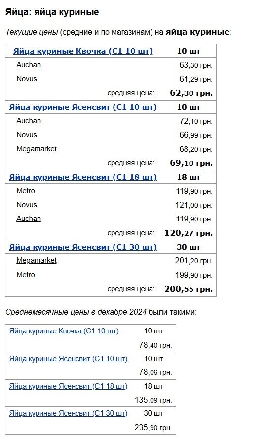 Курячі яйця показали суттєве зниження цін. Наприклад, упаковка з 10 яєць "Квочка" подешевшала з 78,40 грн до 62,30 грн. Яйця "Ясенсвіт" у упаковці по 10 штук також знизилися в ціні – з 78,06 грн до 69,10 грн. Аналогічне зниження спостерігається і для великих упаковок: ціна на 18 штук зменшилася зі 135,09 грн до 120,27 грн, а на 30 штук – з 235,90 грн до 200,55 грн.