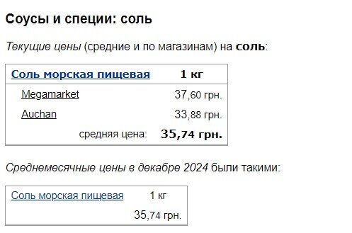 Щодо солі морської харчової ситуація стабільна: середня ціна практично не змінилася, склавши 35,74 грн за кілограм. У різних магазинах ціна варіюється від 33,88 грн у Ашан до 37,60 грн у МегаМаркет.