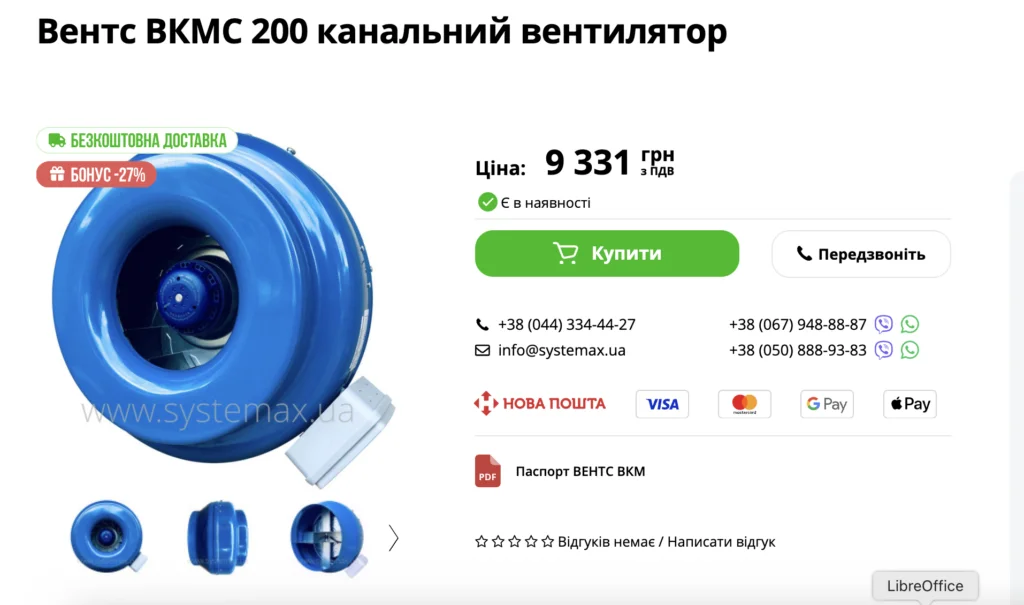 На канальному вентиляторі ВКМС 200 будівельники зароблять зверху не менше трьох тисяч, адже в магазинах цей виріб коштує в середньому 9000-9300 гривень за штуку (в Розетці на тисячу дешевше), а у кошторис його включили 11197 гривень.