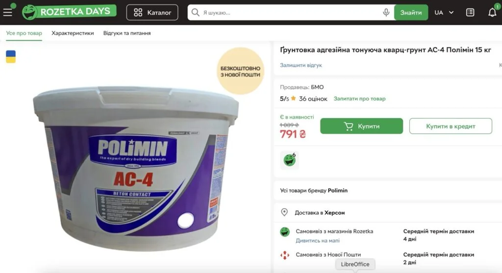 Ґрунтовка адгезійна тонуюча кварц-грунт АС-4 Полімін місту коштуватиме 108 гривень за кілограм, тоді як на Розетці, по акції, вона коштує 53 гривні, ще й безкоштовною доставкою на Нову пошту. А без акції, в Епіцентрі, така ж ґрунтовка коштує 79 гривень за кілограм. Переплата на цій позиції складе мінімум 1300 гривень.
