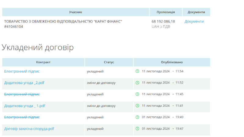 Багатомільйонний підряд отримало ТОВ “Карат Фінанс”, яке раніше звинувачувалось в участі організованої злочинної групи, привласнення та відмиванні бюджетних коштів, завищених цінах та несплаті податків. Пропозиція товариства становила усього 1% нижче від очікуваної вартості.