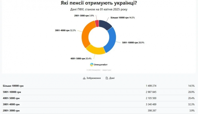 Майже 1,5 млн українців або 14,5% від загальної кількості одержують понад 10 000 грн пенсії. Середній розмір становить 15 640 грн (374 долари).Близько 3 мільйонів або 29% отримують 6860 грн або 164 долари. 20% пенсіонерів або 2,1 млн громадян отримують близько 4500 грн або 107 доларів.