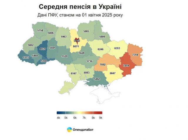 Традиційно найвищі пенсії виплачують у Києві: у середньому - 8708 грн, що на 37% вище за середню по країні.У Донецькій області виплата становить 7814 грн (+23%), а в Луганській області - 7314 грн (+15%). Найменші пенсії — у Чернівецькій (5100 грн) та Тернопільській областях (4931 грн).