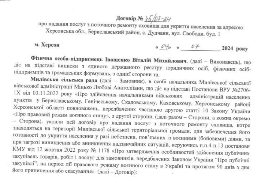 Милівська сільська рада, що в Бериславському районі Херсонської області, уклала угоду на поточний ремонт укриття вартістю понад 882 тисячі гривень із підприємцем, який зареєструвався лише у травні 2024 року. Про це повідомляє «Антикорупційний вимір» із посиланням на Прозорро.Так, виконавцем робіт з поточного ремонту сховища для укриття населення в Дудчанах на Бериславщині має стати ФОП Іващенко Віталій Михайлович, зареєстрований лише 17 травня 2024 року.