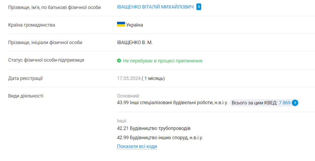 Втім, ФОПом Віталій Іващенко вже був: 4 квітня 2022 року припинив свою діяльність, але у травні 2024 року поновив. Досвід роботи з бюджетними коштами у пана Іващенка також є: сховища не ремонтував, але електромонтажні роботи виконував.