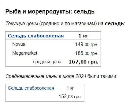 Слабосолона оселедець подорожчала з 152,03 грн/кг до 167,00 грн/кг. Однак у деяких супермаркетах вона продається і дорожче – 185,00 грн/кг (МегаМаркет). Найдешевше ви можете придбати її в Новусі – 149,00 грн/кг.