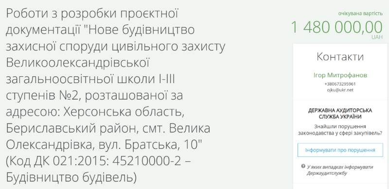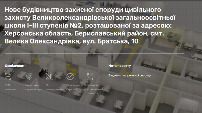 На будівництво шкільного укриття держава виділила понад 100 мільйонів гривень. Про це повідомив Центр публічних розслідувань з посиланням на екосистему Dream.Планується нове будівництво захисної споруди цивільного захисту Великоолександрівської загальноосвітньої школи І-ІІІ ступенів №2. Проєкт належить до програми комплексного відновлення Херсонської області та реалізується за розпорядженням №873 від 19.12.23 начальника Херсонської ОВА Олександра Прокудіна.
